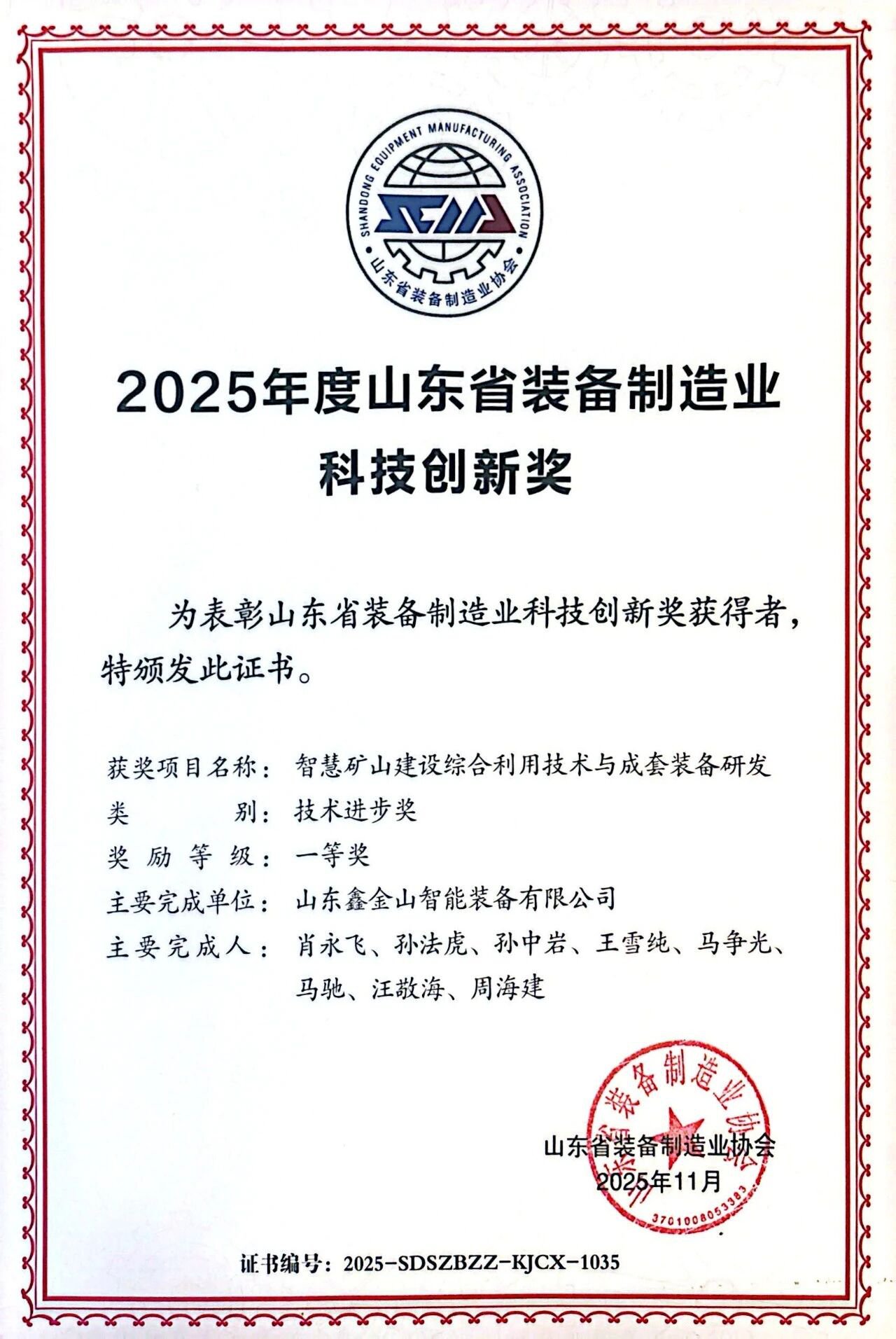 山東省裝備制造業(yè)科技創(chuàng)新獎是全省裝備制造行業(yè)科技創(chuàng)新的最高榮譽之一,旨在表彰在技術(shù)研發(fā)、產(chǎn)品創(chuàng)新中作出突出貢獻的企業(yè)與項目,助力全省裝備制造業(yè)轉(zhuǎn)型升級與高質(zhì)量發(fā)展。本次評選經(jīng)專家評審委員會嚴苛審核,從數(shù)百個申報項目中擇優(yōu)遴選,鑫金山憑借扎實的技術(shù)積累、突破性的創(chuàng)新成果,成功躋身一等獎榜單,彰顯了公司在礦山裝備領(lǐng)域的硬核實力。